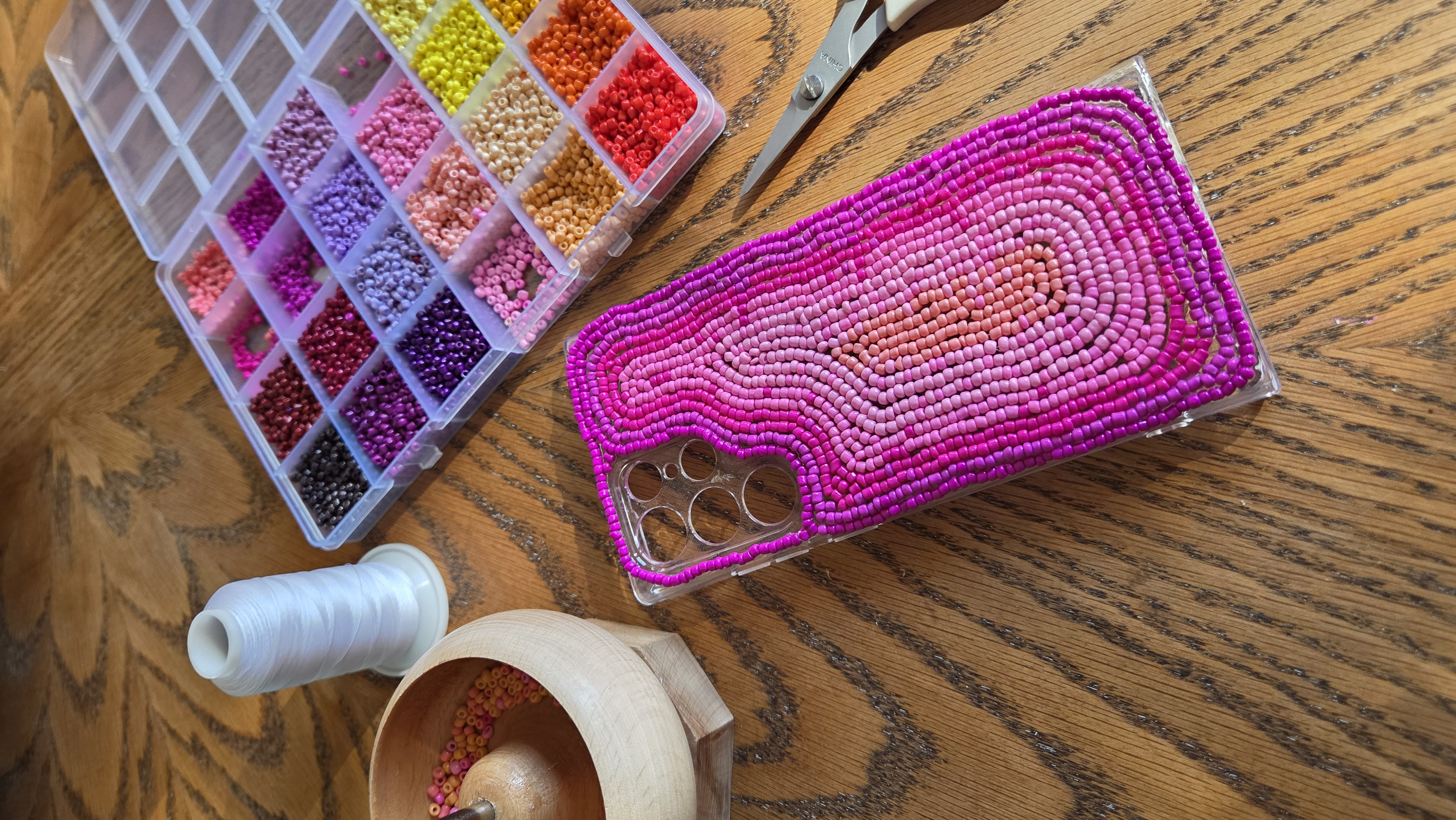 If you love projects that mix beauty with a bit of technique, this one is pure joy. A clear case, a bead spinner, and a handful of pink beads are all you need to create something totally fresh for your phone.
