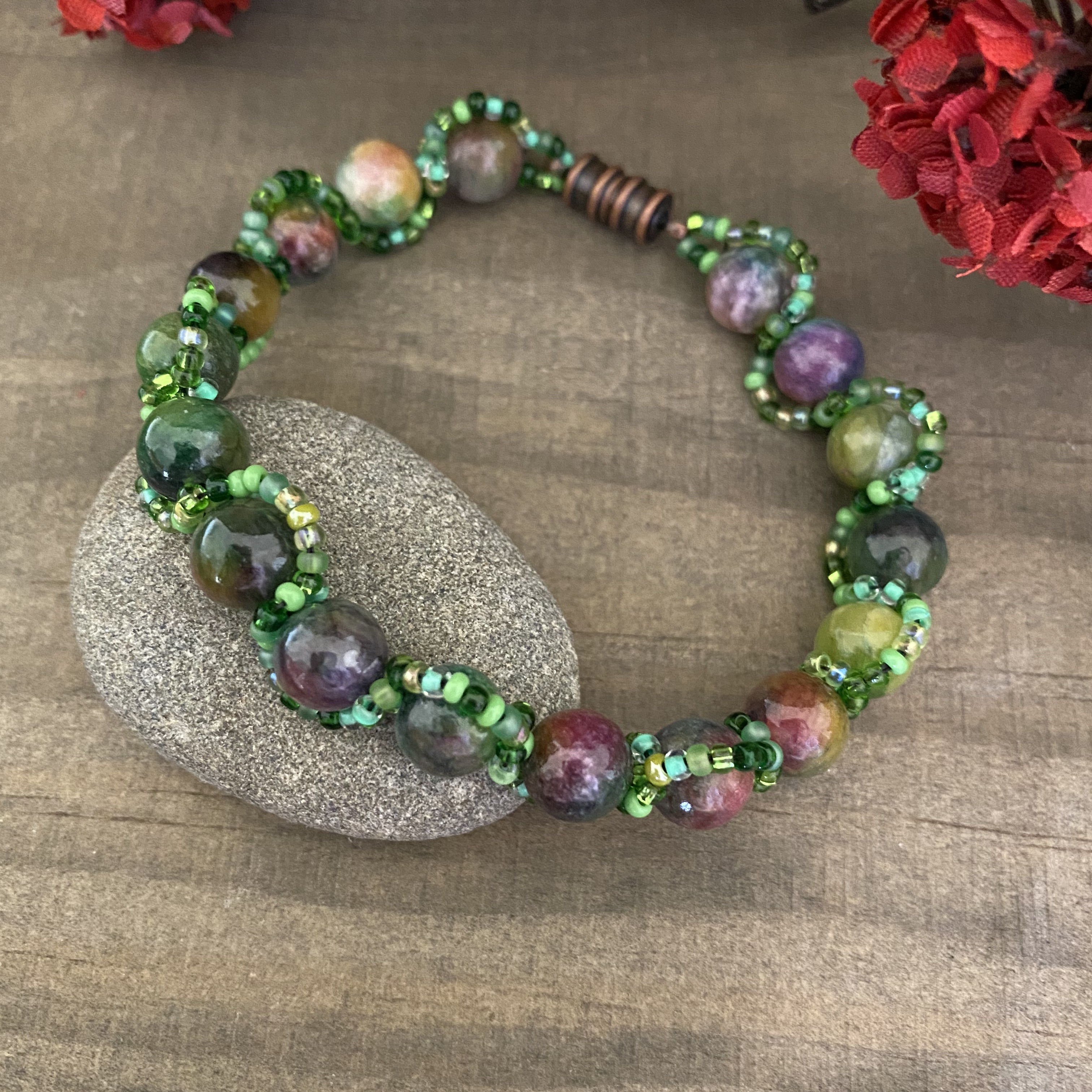 In this class, we will create a swirling stitch of chocolate seed beads around pink raspberry beads and add a magnetic clasp!